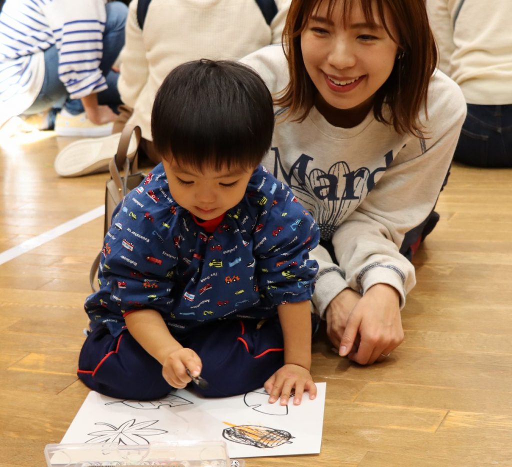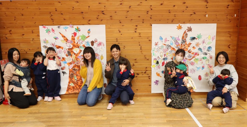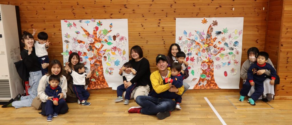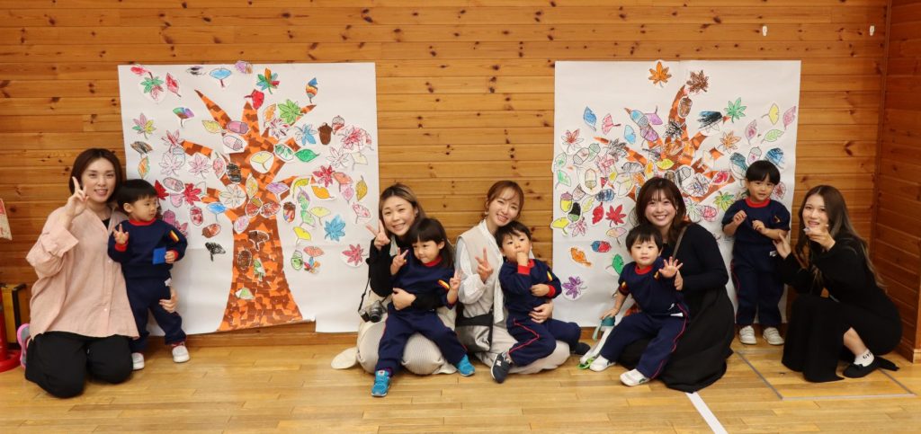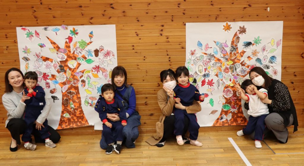 この日の親子保育の活動は『親子で共同製作』… 葉っぱに色を塗って、綺麗に紅葉した〝小さな秋〟を作りますよ(^_-)-☆
