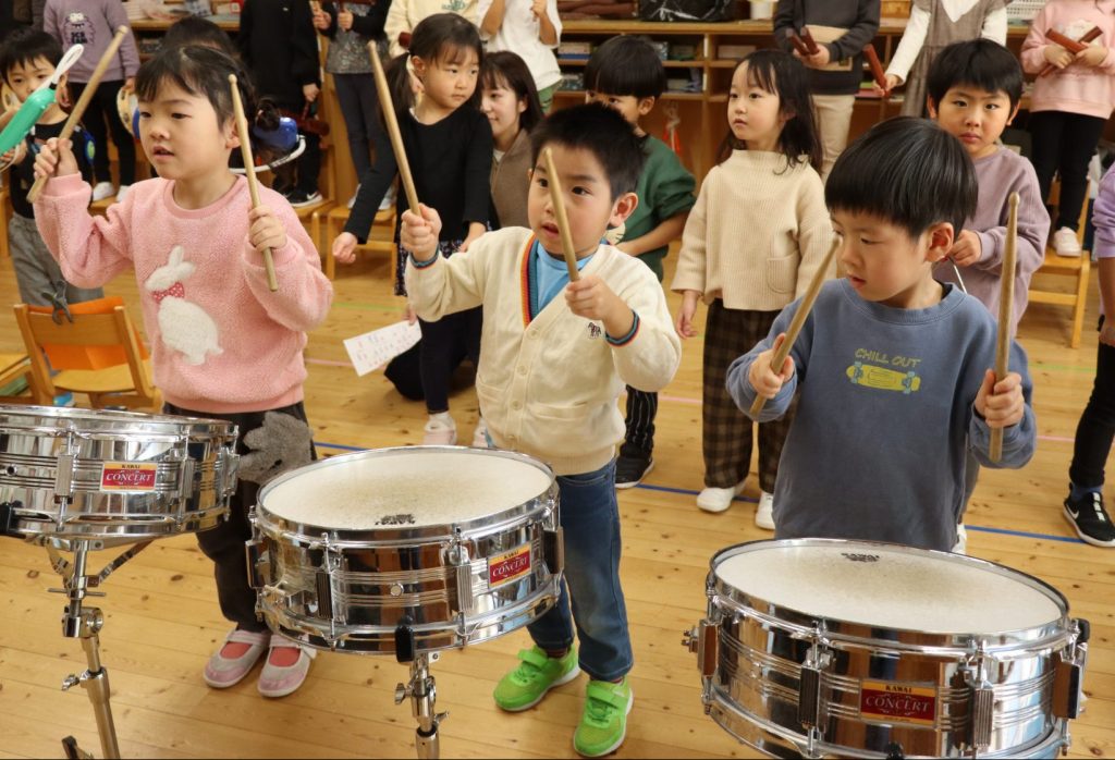 年長児達のハーモニカの活動に続き、もう一つの音楽リズム活動の様子です😄 満3歳児クラス「つぼみぐみ」の子供達と年少児達は、太鼓やタンバリン、鈴やウッドブロックなどの打楽器を使った音楽リズム活動をコツコツと積み重ねています(笑)