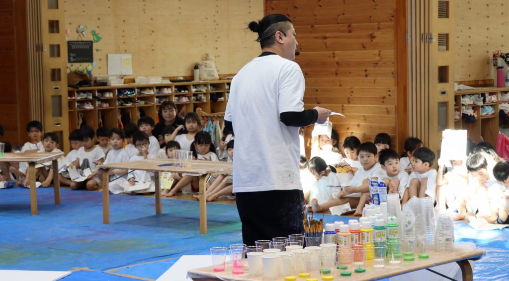 今回は、年長児達と五十嵐氏が共同作業で大きなキャンバスに絵を描き、最後に五十嵐氏がそれを仕上げ、卒園記念作品として園に寄贈していただける他、ポストカードとしてプレゼントもしてくれるという、ワクワク感満載のイベントを行いましたぁ~(笑)
