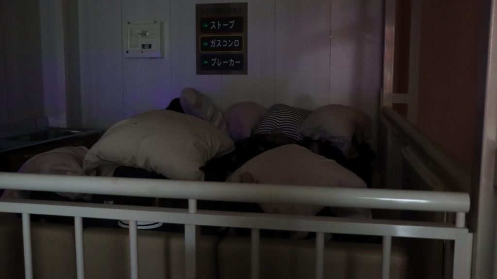 地震体験コーナーでは、震度7の揺れを再現した機械に乗り…