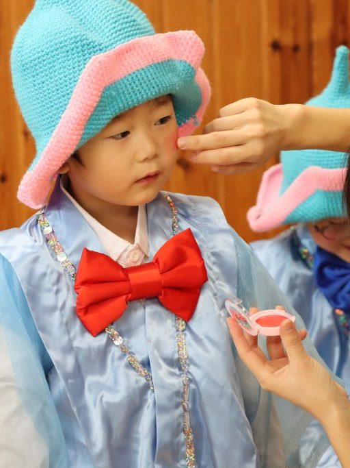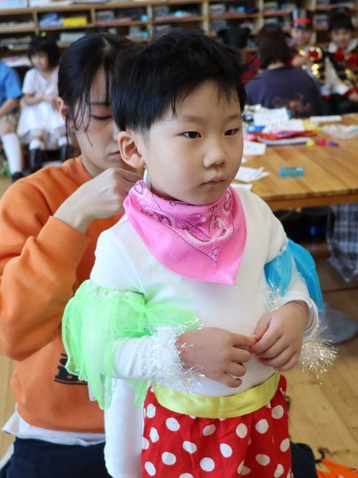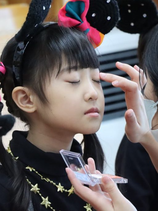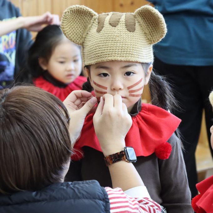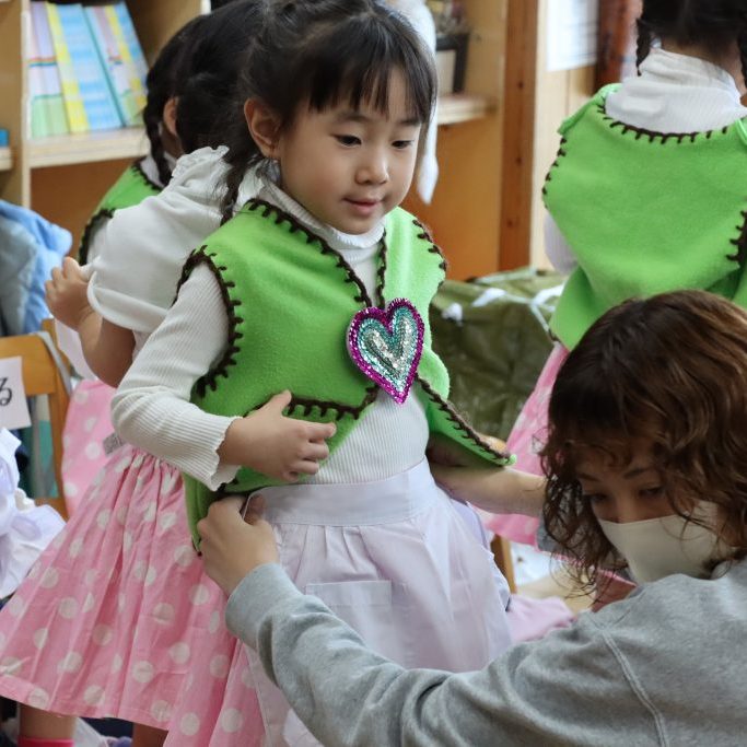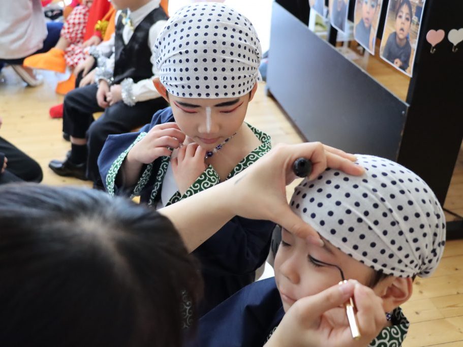 まずは楽屋の様子から… ボランティアの保護者の方にお手伝いいただいた可愛らしい衣装に身を包み準備を進める子ども達😉