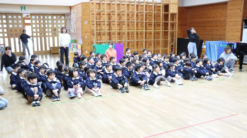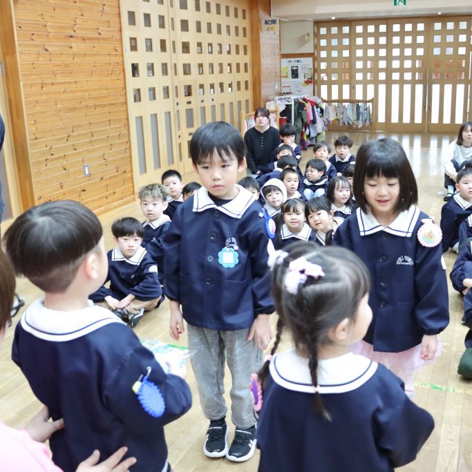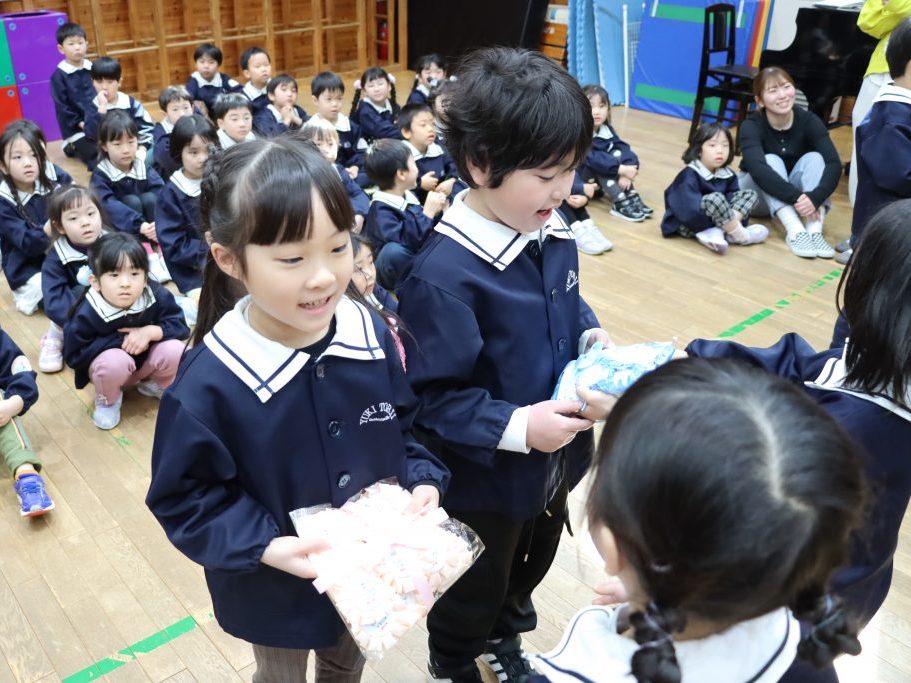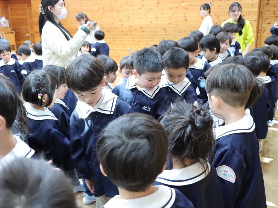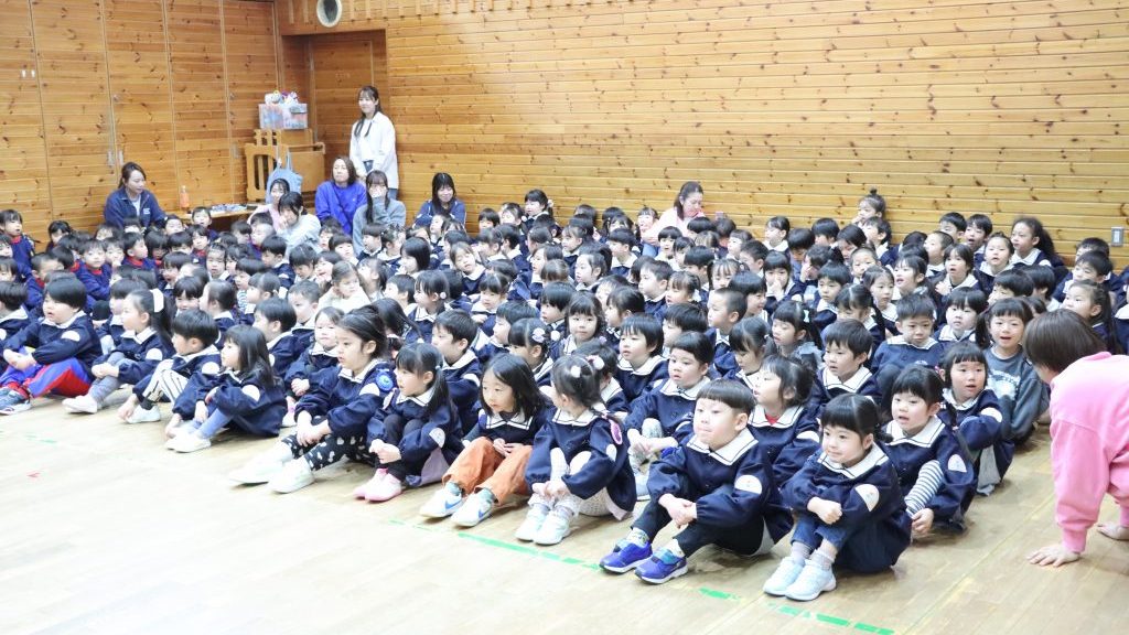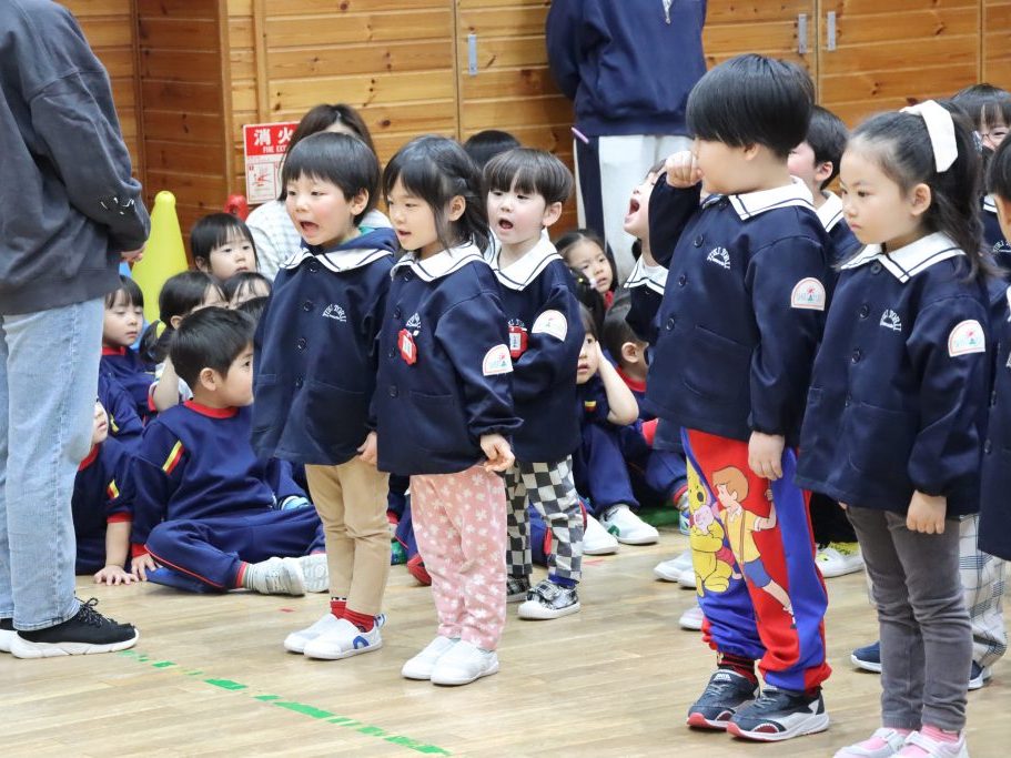 全園児がホールに集まり、卒園を迎える年長児達と過ごす「お別れ会」
