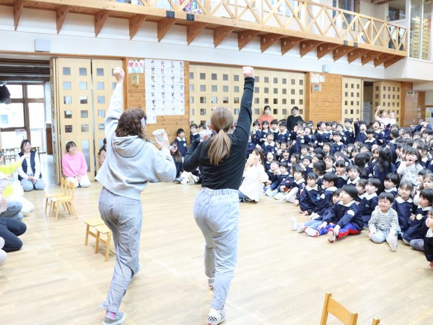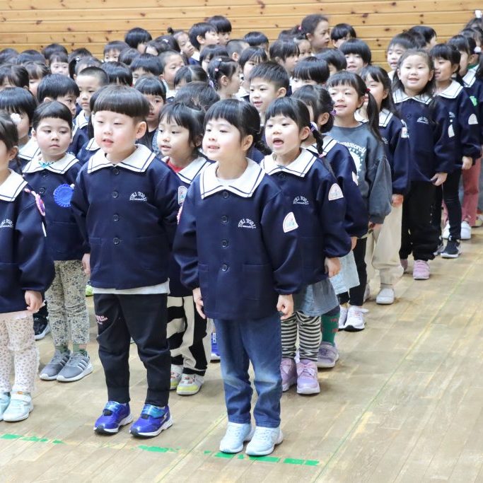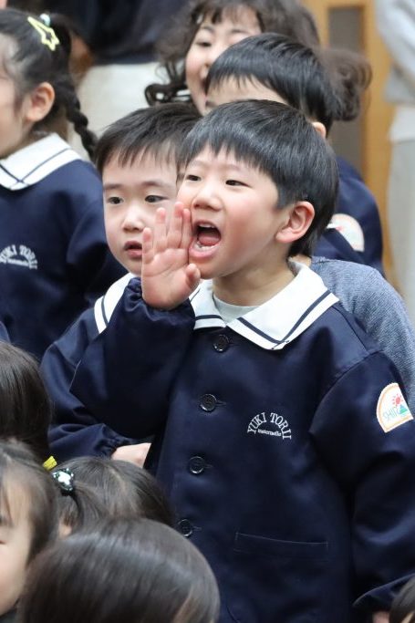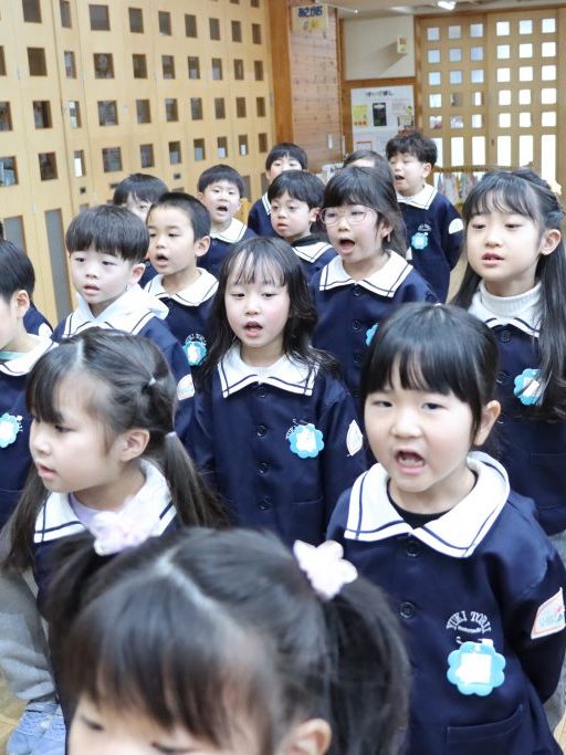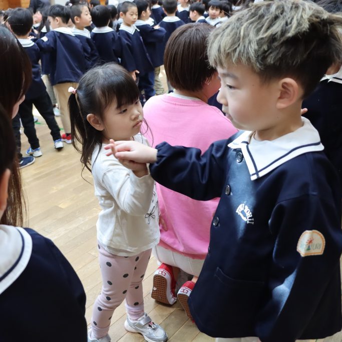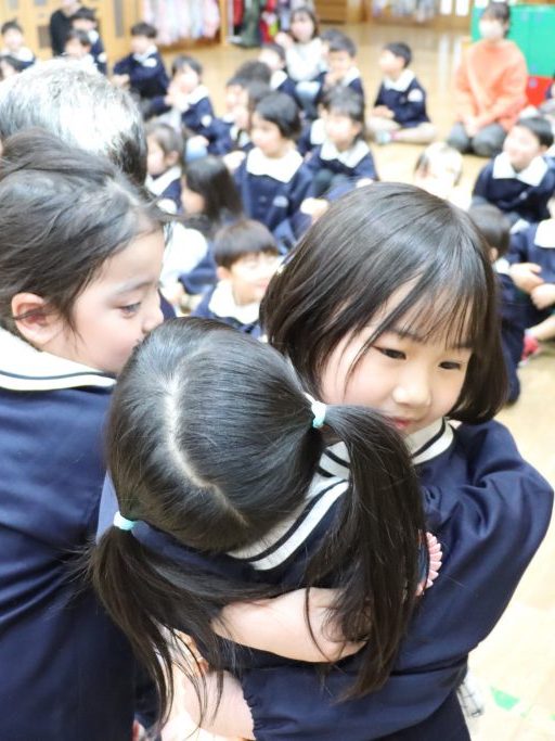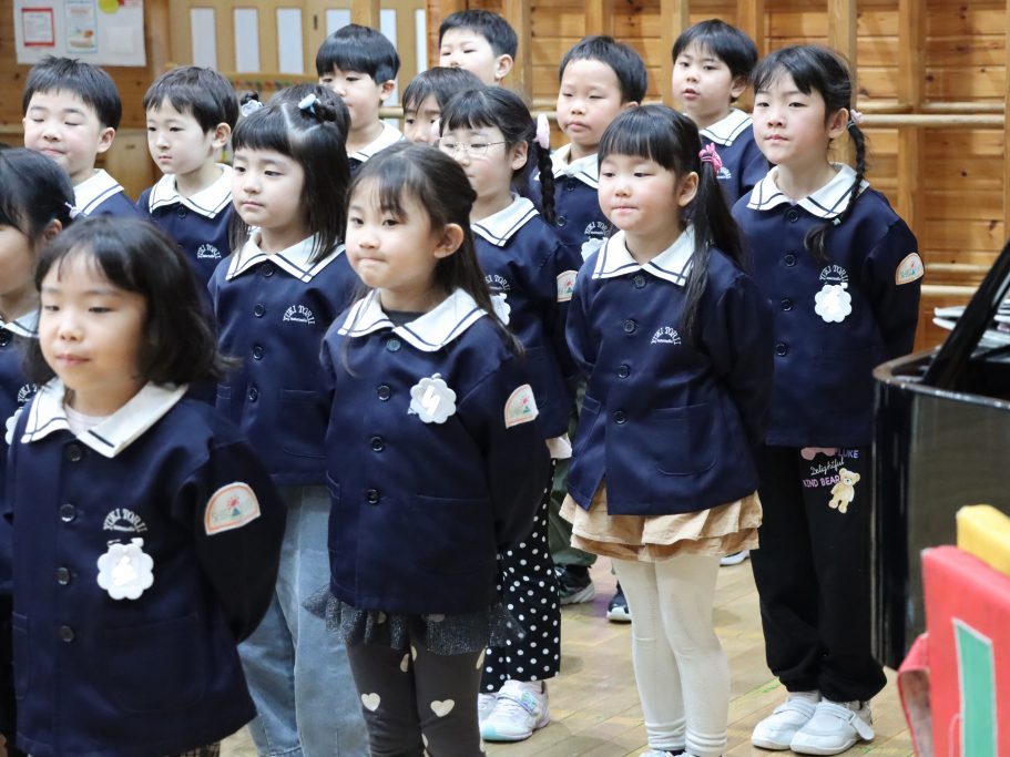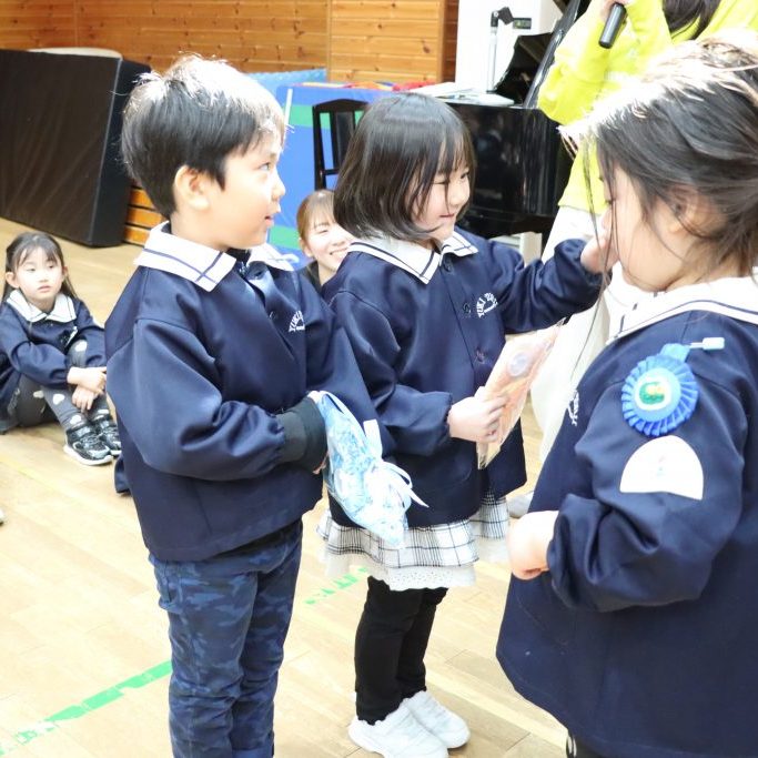 全園児がホールに集まり、卒園を迎える年長児達と過ごす「お別れ会」