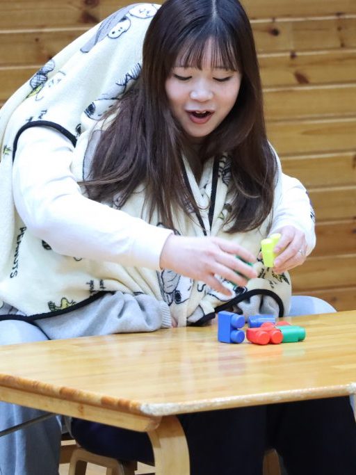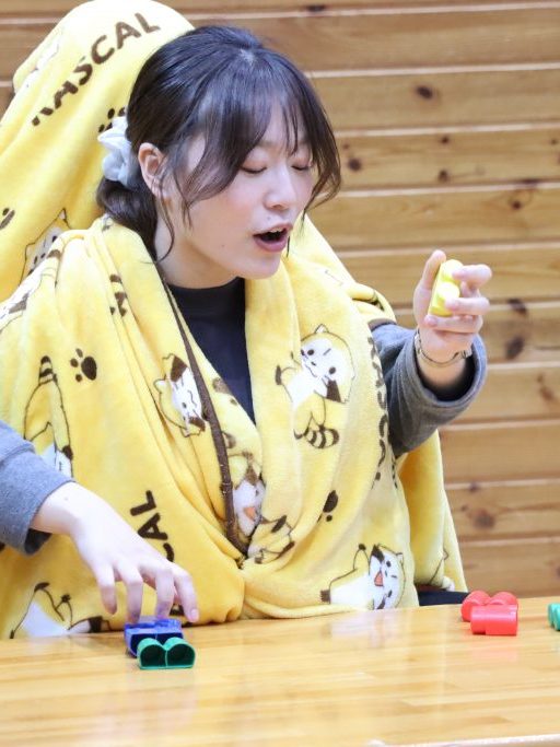 まず最初の対決は、年少児担任による「二人羽織ブロック早組み立て対決」 二人羽織でお題通りにブロックを組み立てるゲームです😘